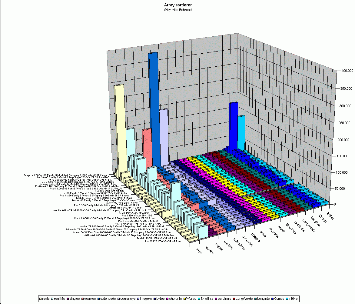 - zwischen den 32bit und den 64bit-Datentypen (comp + Int64) gibt es einen deutlichen Bruch, höchstwahrscheinlich weil unter Windows 32bit mit 32-bit Compiler erstellt und da noch keinen 64bit CPUs getestet wurden, entgegen den Werten von vorzeichenlos (comp) und vorzeichenbehaftet (Int64) aus dem ersten Benchmark gibt es hier keine wesentlichen Unterschiede