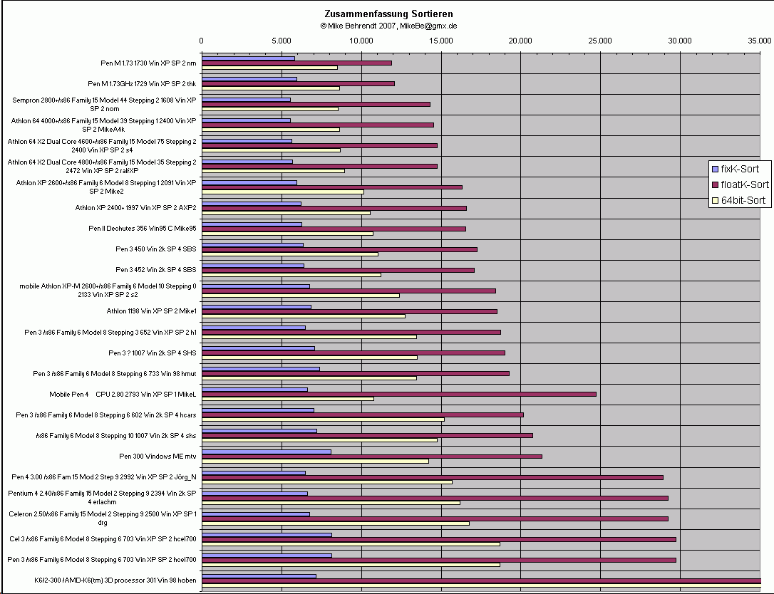 Erkenntnis: Im 32bit-Bereich gibt es nur geringe Unterschiede, die PentiumM führen vor Athlon XP. Im Gleitkomma-Bereich das gleiche Bild, aber mit größeren Abständen. Ebenso im 64bit-Vergleich. Der ältere K6/2 kann hier nicht mehr mithalten, im Gleitkomma-Sortieren kommt er auf über 200.000.